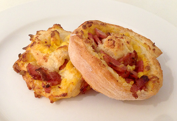 For my egg and bacon scrolls I made soft scrambled eggs (made with 8 eggs) and fried 4 rashers of diced bacon. Spread out the eggs on top of the dough and sprinkle the bacon on top.