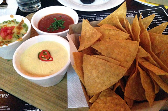 We started with a trio of dips – not your ordinary dips! Spinach & artichoke, queso (a cheesy sauce) and Mexican tomato salsa served with corn chips.