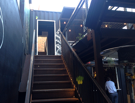 Laneway is deceptively large inside. On ground level there are tables and stools and the first level has more seating overlooking Hindley Street. The upper level has been fitted with a floating Canary Island Pine bench, and up on the third level, above the seating, hang lights in jars that twinkle in the darkness.