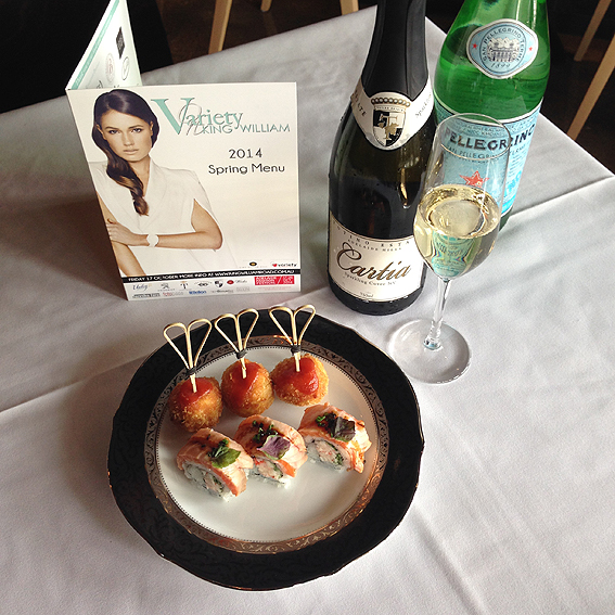 Our first venue was Ichitaro Dining. Two canapés were on offer at this newly established Japanese restaurant. The aburi salmon rolls – flame grilled salmon, Kewpie mayo, and crab salad roll served with Teriyaki sauce – are made every day with fresh salmon, with the rice and nori imported from Japan. It takes approximately three-and-a-half hours just to make one roll! And a traditional Japanese yasai croquet – fried sweet potato, pumpkin, potato, onion, quinoa croquet served with port sauce. Totino Estate Sparkling Pinot Chardonnay and Fox Gordon Pinot Grigio were poured for us to enjoy.