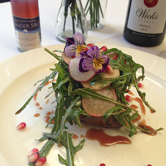 We then walked to nearby Faraja. Faraja is a Swahili word for ‘Peace, comfort and relief’, which reflects the restaurant’s philosophy. This is where we tried the first of two main courses: barramundi fillet baked in banana leaf, served with celeriac and apple remoulade, and a spicy papaya, pomelo and peanut salsa. This was paired with Tomich Hill Sauvignon Blanc. This was by far my favourite dish of the day. The fish was soft and moist, and the textures and flavour combinations – peanut, spice and apple – blended surprisingly well together. Another favourite was the Bald Hills Olive Grove peppery Wild Lime olive oil, which we soaked up with our sweet brioche roll from Hyde Park Bakery. (Must buy a bottle of that!)