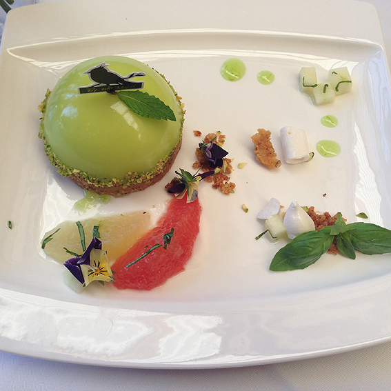 First up was a dish by local café By Blackbird – a mint and vanilla tart on a poppy seed sable base, topped with a basil and citrus gel, lime sauce and garnished with a mix of fresh citrus and green apple crumble. I loved the variety of textures in this dish: from the softness of the mousse, to the crumble of the poppy seed base, to the soft gels and the citrus fruit. Wicks Estate Chardonnay Pinot Noir Sparkling accompanied this dessert.