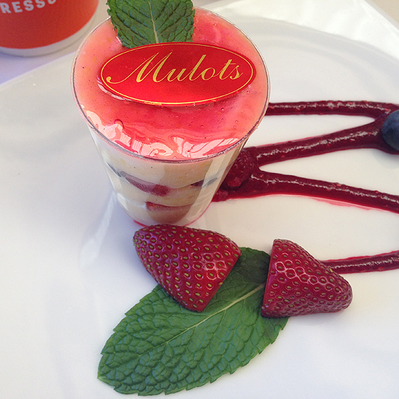 Following this was French dessert specialist Mulot’s Patisserie, with a chiboust light vanilla bean custard mixed with egg white, filled with berries, served with raspberry couloirs, fresh berries and a mint leaf. This was so light and fluffy – just like eating a vanilla and berry-flavoured cloud! Tomich Hill Sparkling M NV Chardonnay Pinot was served with this dessert.