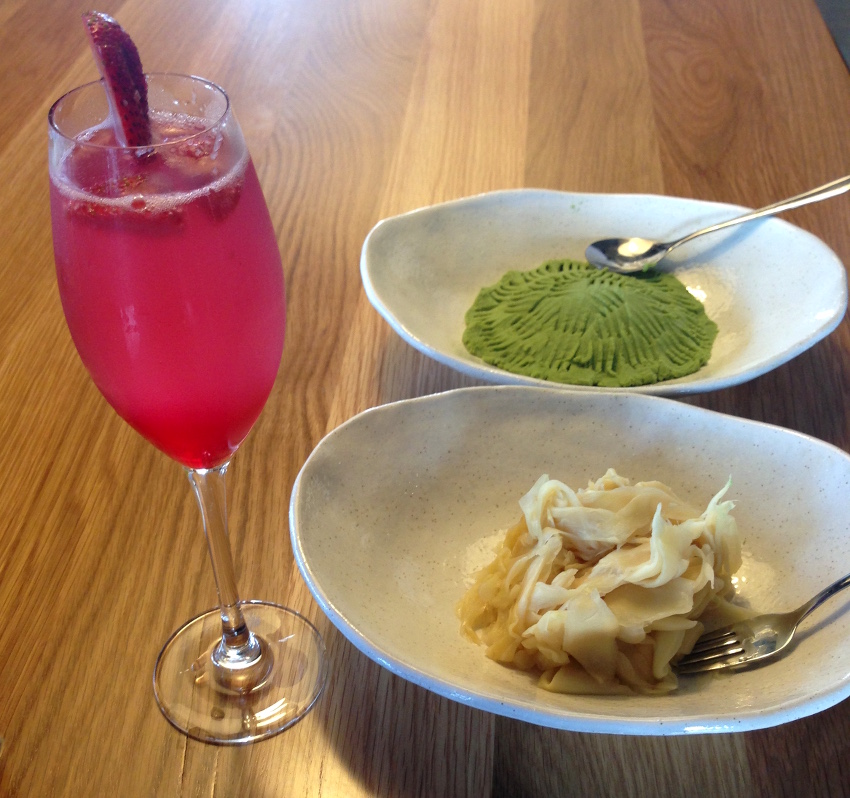 A cranberry champagne kicked off the evening and I noticed the large dishes of wasabi and pickled ginger. We were in for a good night!