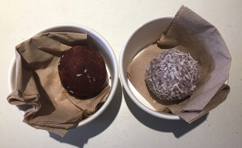 We also grabbed a couple of gluten free and low fructose balls to try later. The spiced cacao ball was dense with an almost too subtle spice flavour, which they could easily ramp up. Our favourite was the almond, coconut and berry ball – very refreshing, light and creamy.