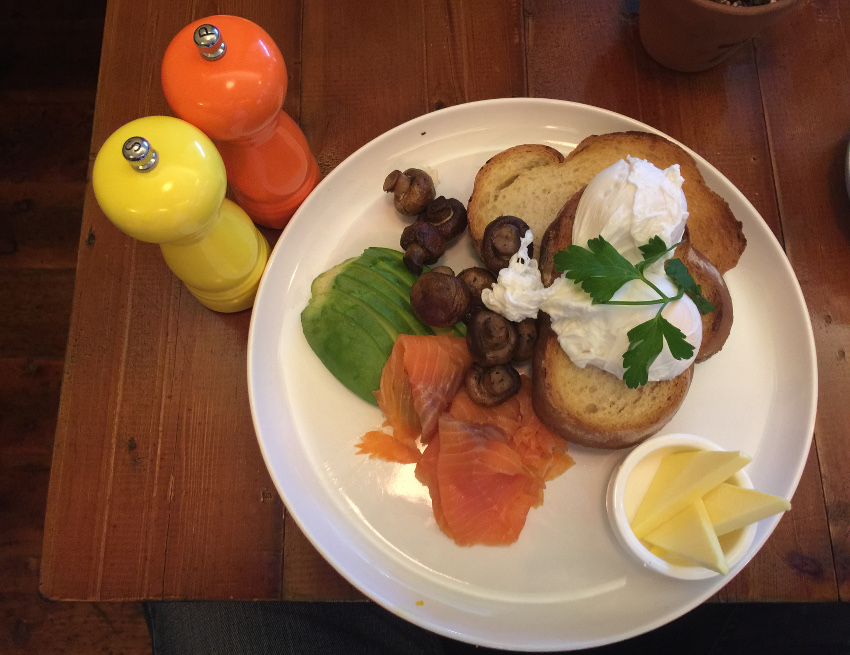 For breakfast I chose the ‘Dutch Baby’ pancake, an oven baked puff pancake served with ricotta cream and orange maple syrup, while my husband went for the Red House big breakfast. You basically get to choose your own big breakfast by selecting five items for a set price, or you can add even more for $3 each. He chose poached eggs, smoked salmon, hash brown, avocado and mushrooms, along with large coffees for both of us.