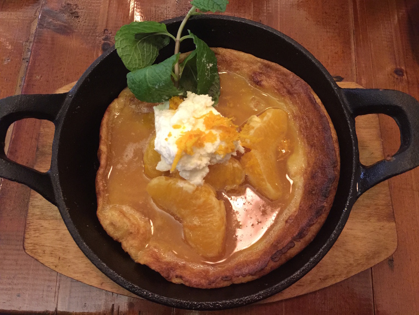 We had to wait a little while for our breakfast as it takes about 20 minutes for the pancake to cook, and we were told this when ordering. The pancake came out in the metal dish it was cooked in, still piping hot. I could smell the orange and couldn’t wait to taste it.