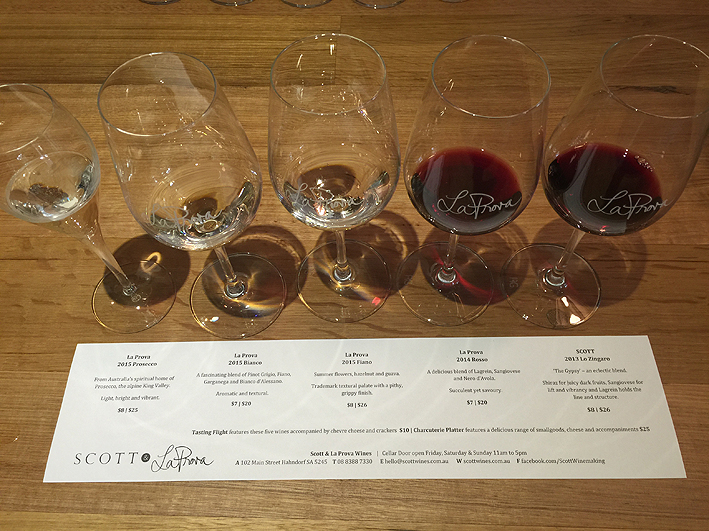 We experienced a ‘Tasting Flight’ where we sampled five different wines; four La Prova and one Scott.