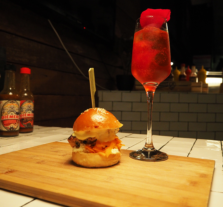 The next slider was braised pulled lamb, slow cooked in pomegranate juice, baby spinach, sweet potato crisp, chilli jam, mint blood orange labneh. This was my favourite slider of the night. The lamb was tender and sweet and the sweet potato crisp was actually crispy and provided another texture.
