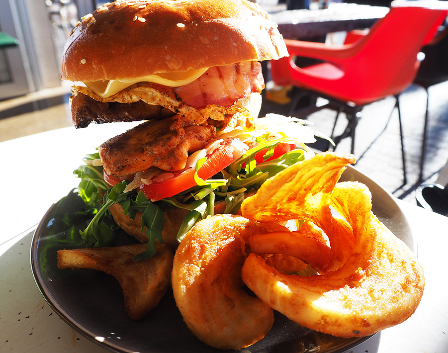 The burger I tried was a ‘Tweety’ burger, which consisted of chicken, rocket, Parmesan, aioli, tomato, Barossa pancetta, free-range egg, and Swiss cheese. I chose a sesame seed bun from the choice of brioche, sesame seed, multigrain or gluten free. This came with a complimentary side of sidewinders (potato).