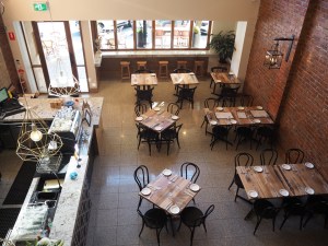 The restaurant is light and spacious with high ceilings and a mezzanine floor.