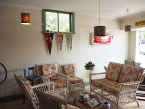 Inside, retro couches, tables and chairs and decorations adorned the café’s walls. Mismatched vintage crockery is used or environmentally friendly take away containers.