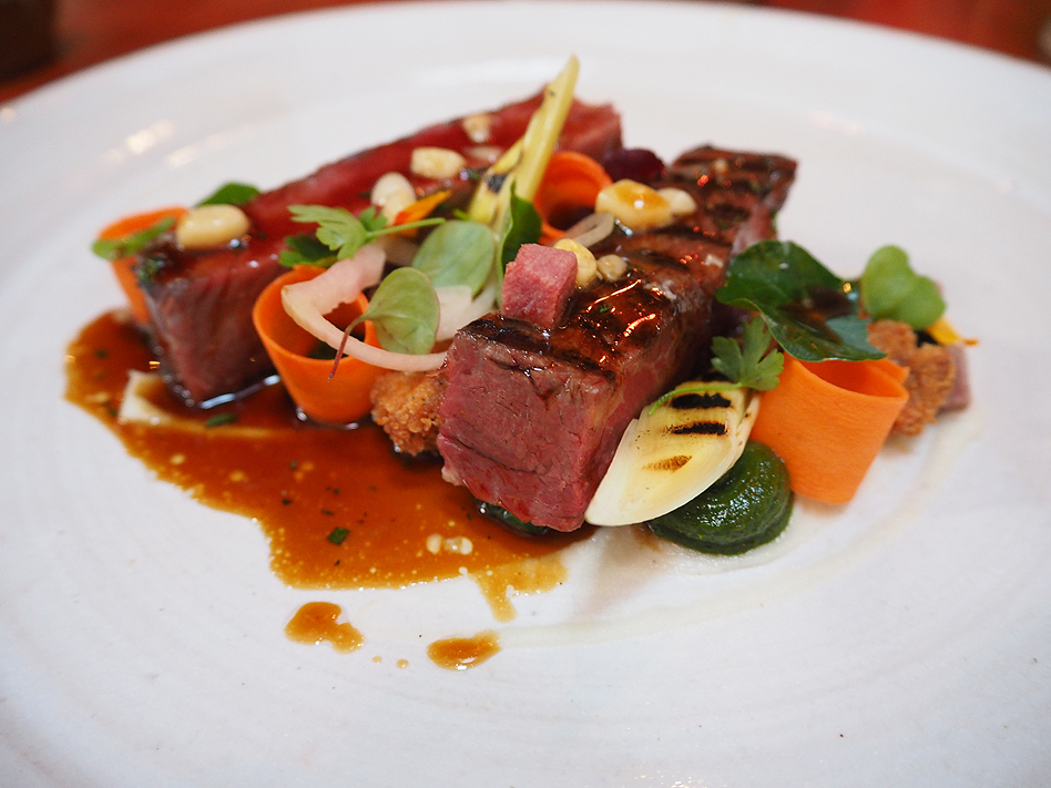 Also, smoked kingfish sashimi, chargrilled octopus, dashi pearls, daikon and yuzu. An absolutely beautifully presented dish. There were so many layers and as I peeled back each layer, it revealed something else. The sashimi was fresh and delicate, the octopus was firm, and the dashi pearls encased in daikon looked so pretty. The seaweed cracker added some crunchy texture.