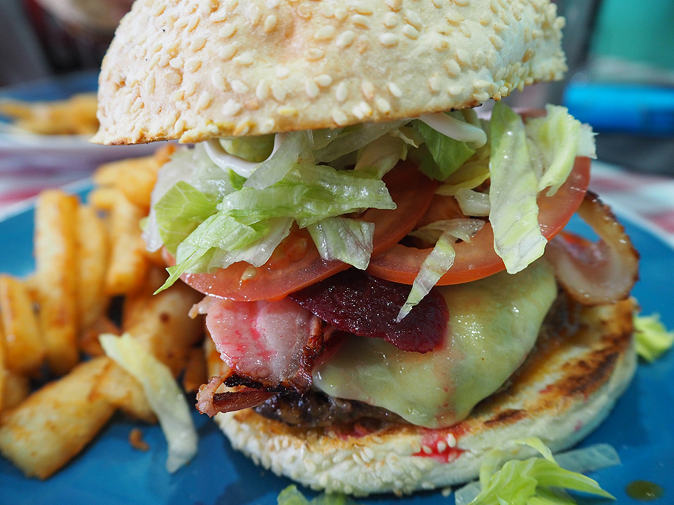 A hamburger with lamb pattie, cheese, bacon, beetroot, tomato, lettuce, mayo and home made ma dud relish served with beer battered fries. It certainly was a big, juicy burger with a bun that held it all together!