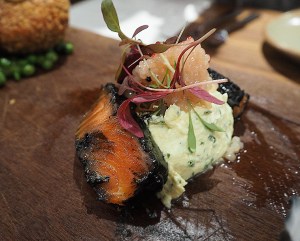 Squid ink ocean trout, horseradish crème fraiche and beetroot, lemon myrtle tapioca. The dramatic squid ink highlights the beautifully soft ocean trout with a hint of smokiness.