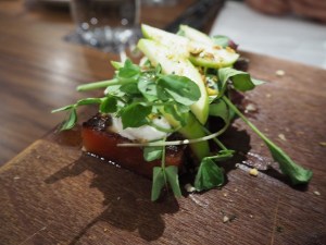 Sangria marinated watermelon, feta, apple and pistachio crumble. A beautifully fresh dish, with a hit of saltiness from the feta.