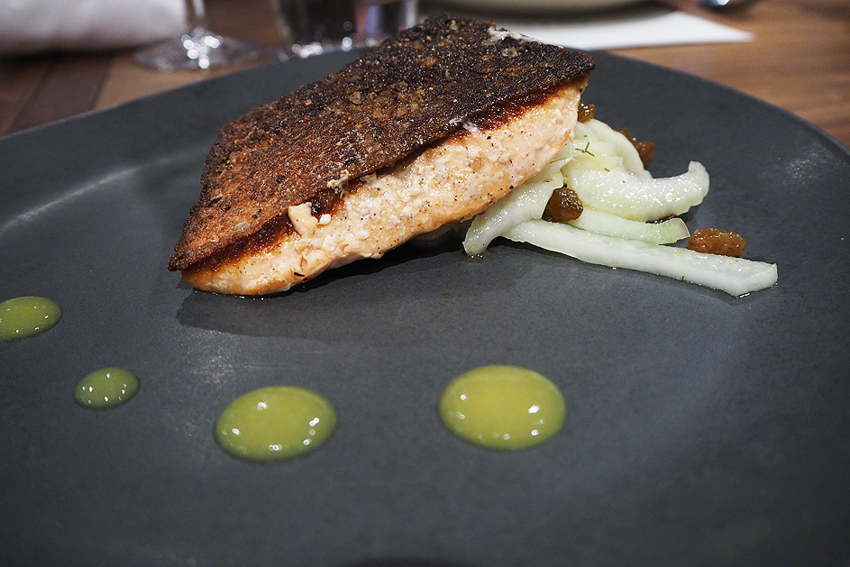 Seared salmon, mandarin gel, fennel and sultanas. You don’t often see sultanas used these days, and their sweetness complimented the fennel.