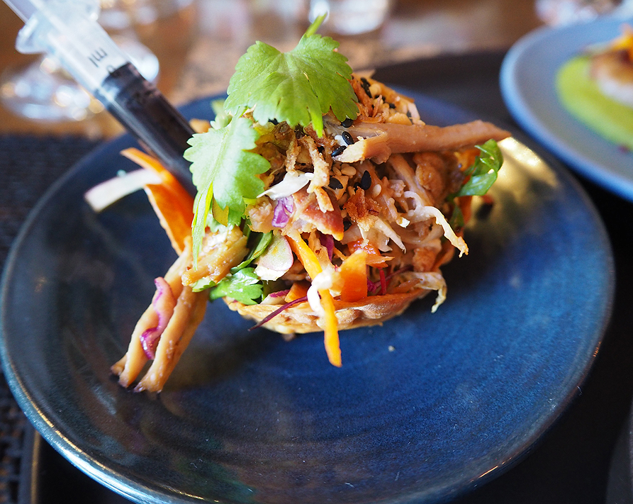 This was followed by confit pulled pork belly in an open crisp wonton shell with a chilli soy & sesame dressing finished with crispy shallots and peanuts served with 4 Pines extra special bitter English Ale. The shell was light and crispy and the pork and slaw was well balanced. The syringe with the dressing added a bit of theatre to the dish.
