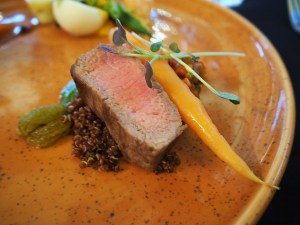SA lamb backstrap, oven baked ratatouille, raisins & quinoa, black olive oil, Dutch carrots, sauce verde served with 2015 Purple Hands old vine Grenache from the Barossa Valley. The backstrap was pink and so tender. And I loved the raisins and quinoa as they added a nutty sweetness to the dish.