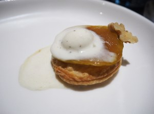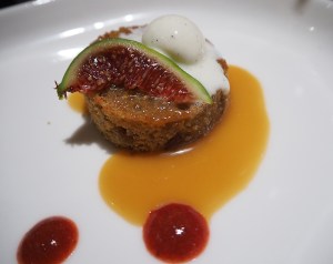 Atlantic Salmon nicoise pan fried, finger potatoes, goji berry & macadamia purée, green beans, steamed eggs, dehydrated olives & heirloom tomatoes served with Mere-Et-Fils Chardonnay from the Adelaide Hills. This was a lovely light dish and everything complemented each other on the plate.