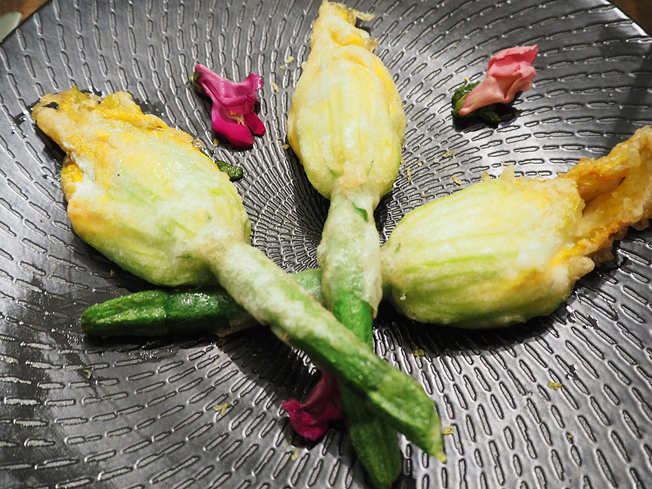 For entrée I had fior di zucchini: zucchini flowers with ricotta, lemon zest, nutmeg, basil with edible flowers. I love zucchini flowers and these didn’t disappoint, with smooth ricotta, strong lemon and a light, crispy batter coating.
