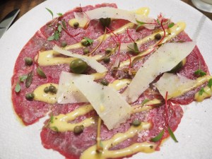 The other entrée was the beef carpaccio: Coorong Angus beef, garlic aioli, baby chard, capers with juniper berries. The beef was sliced incredibly thinly and was beautifully seasoned.
