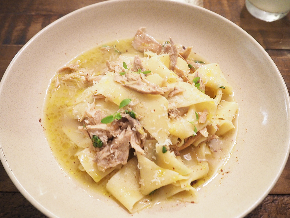 For entrée I couldn’t go past the pappardelle with eight-hour slow braised rabbit in brodo (broth) with hazelnuts and marjoram. The last time I had a rabbit pasta dish it was in a creamy sauce and I really enjoyed it. When I ordered this the waitress alerted me to the fact that there may some small bone pieces in the meat from the slow cooking process. I appreciated the warning as I did find a couple if small pieces. Instead of having a creamy sauce this included the broth that the rabbit was cooked in. The meat was tender with a delicate flavor and I loved it.