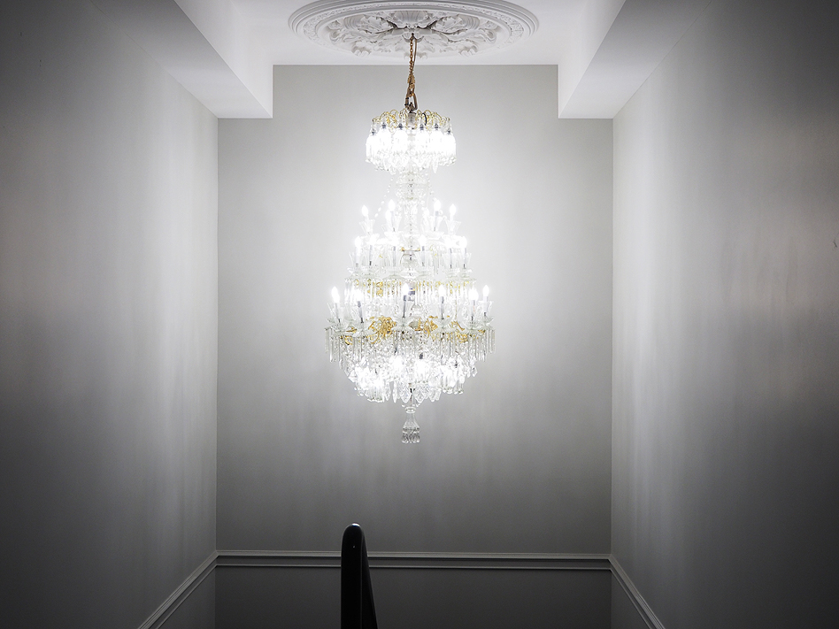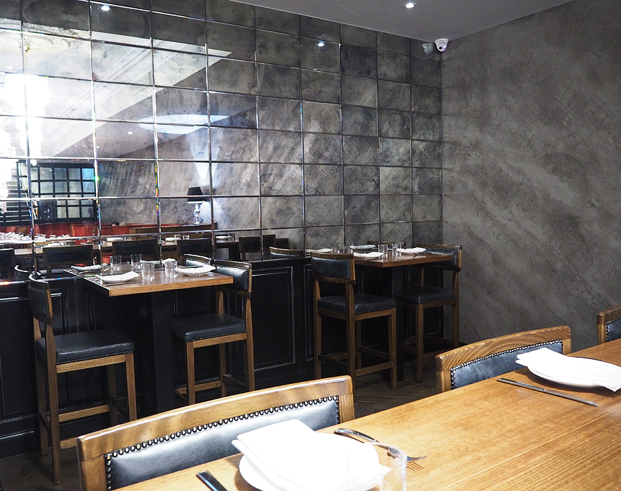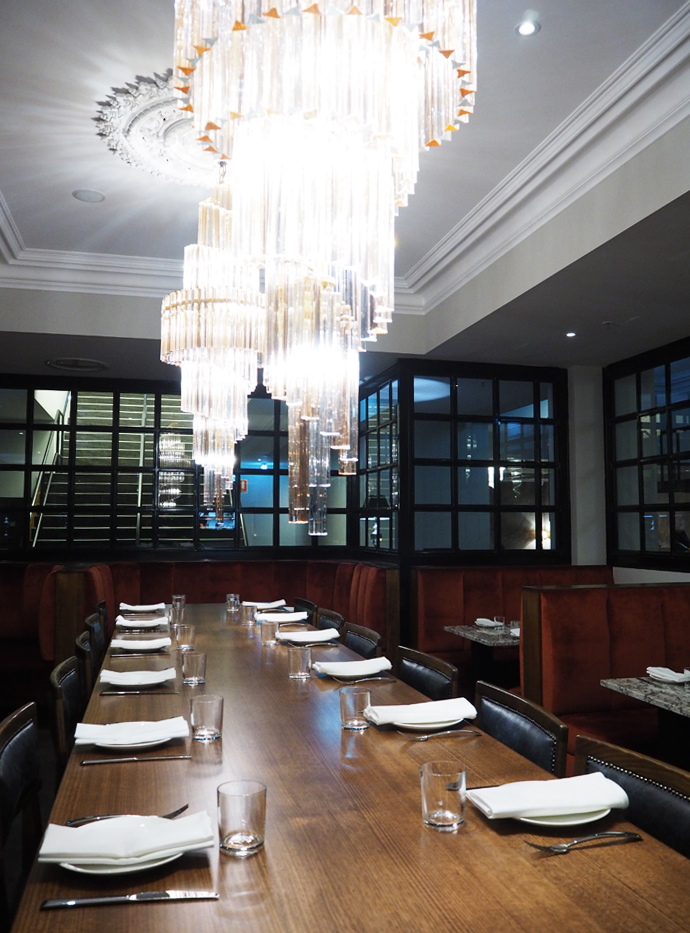 I love the interior, with a glamorous old-world vibe; parquetry flooring, stunning chandeliers, velvet booths, dark wood with off-white walls, crystal lamps and granite table tops. Everything screams glamour.