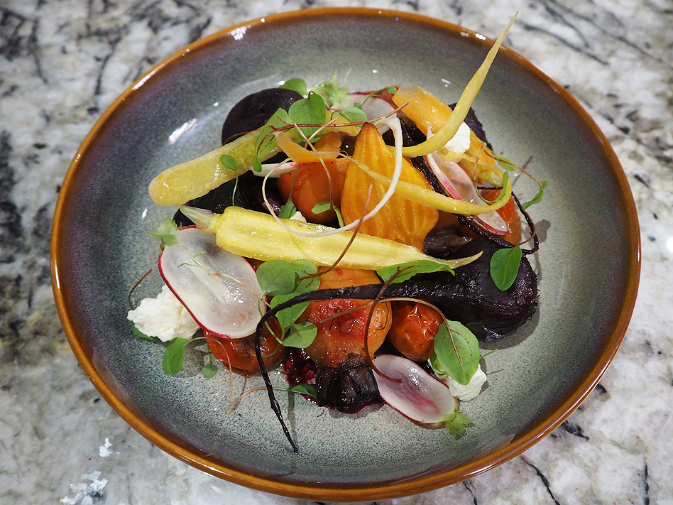 Next was a beetroot salad with roast beetroot (red and yellow), beetroot puree, Persian feta, roasted cherry tomatoes and onion, heirloom carrots and thin slices of radish. A visually beautiful dish with contrasting flavours and textures. The roast beetroot was sweet and earthy and the feta melted in the mouth. This was our favourite dish of the night.