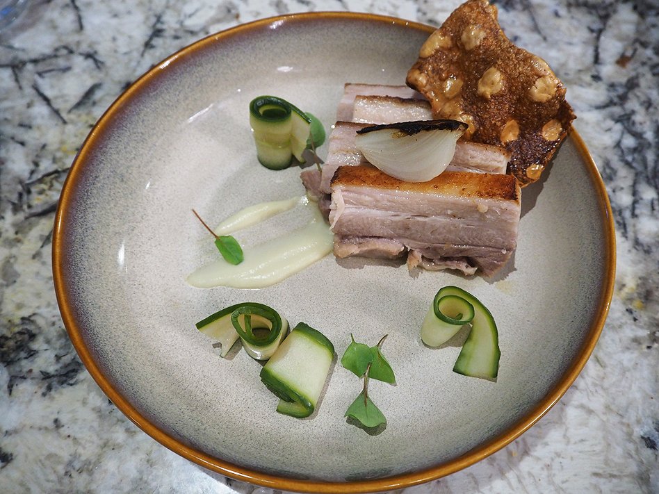 In addition to the complimentary dishes we also ordered a small plate of roast pork belly, which was served with charred onion, cucumber, cauliflower puree and a piece of crackling. My husband thought it was one of the best pieces of pork belly he’s had in a long time. The crackling was wafer-thin, which isn’t usually our preferred style but it completed the dish perfectly.