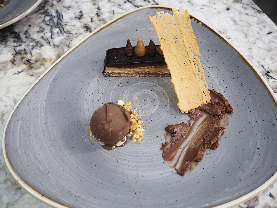 And for dessert, opera slice with an amazingly thin almond tuille, chocolate ice cream, chocolate ganache and hazelnut praline. A blend of sweetness, bitterness and crunch.