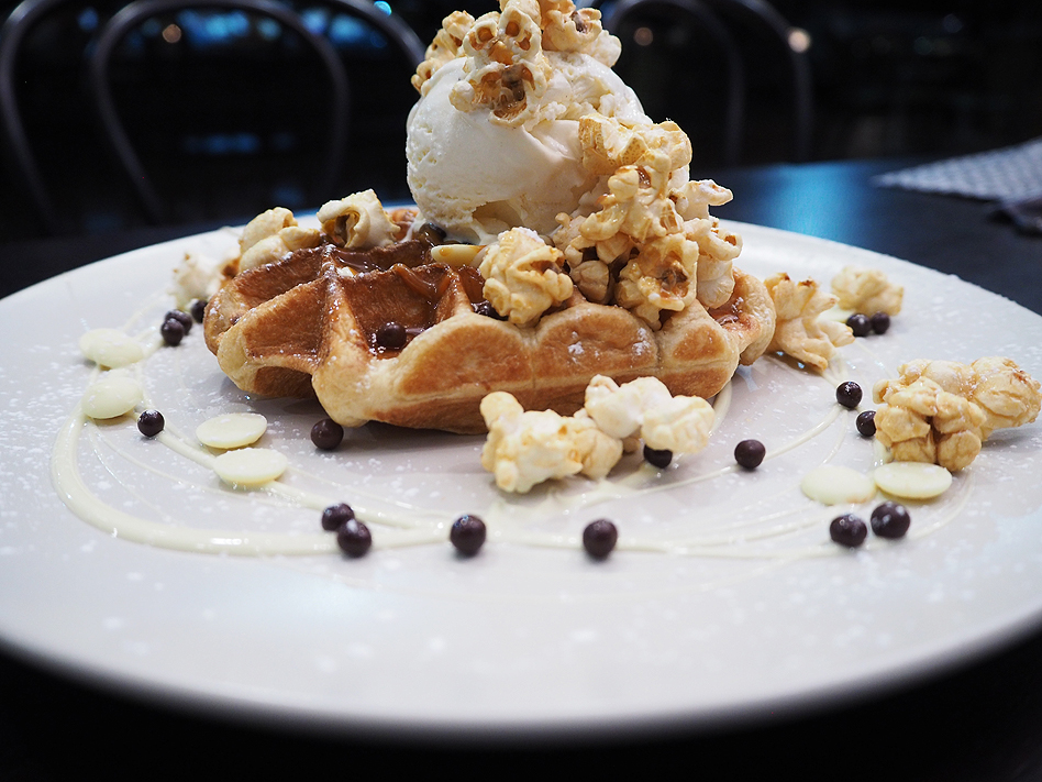 If you love popcorn try this popcorn waffle: a warm Belgian waffle, drizzled with maple syrup and pure melted white chocolate, topped with dulce de leche, caramel popcorn and chocolate coated wafer balls. Served with French vanilla ice cream!