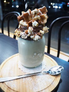 Salted caramel waffle shake topped with a Belgian waffle, dulce de leche and caramel popcorn.