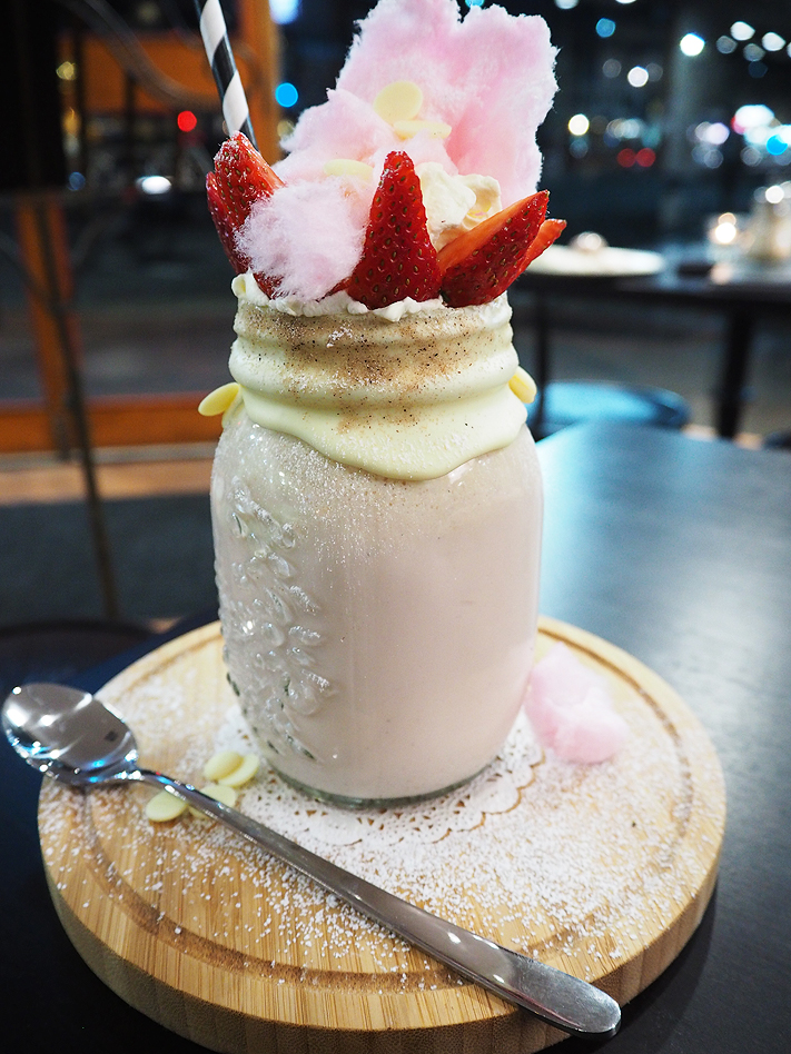 Wild strawberry shake topped wit fresh strawberries. Whipped cream and fairly floss.