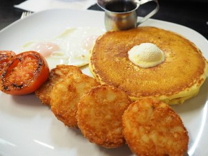 Sometimes you just want comfort food – especially in winter. And that’s what we got. Two ‘Tookie’ breakfasts: two pancakes served with whipped butter, hash browns, eggs and grilled tomato. Warm, oozing egg yolk and crunchy hash brown. That hit the spot, along with the large coffee!