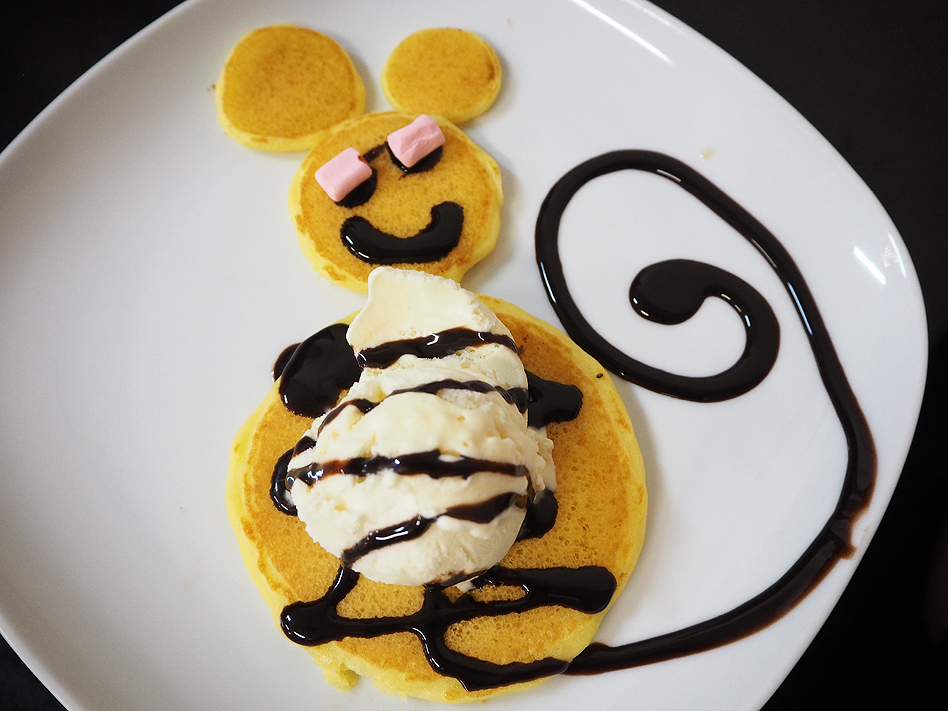 Our son ordered ‘Mickey Mouse’: a buttermilk pancake served topped with chocolate fudge and ice cream. Unfortunately wasn’t quite enough for a 10-year-old, so he shared some of ours!