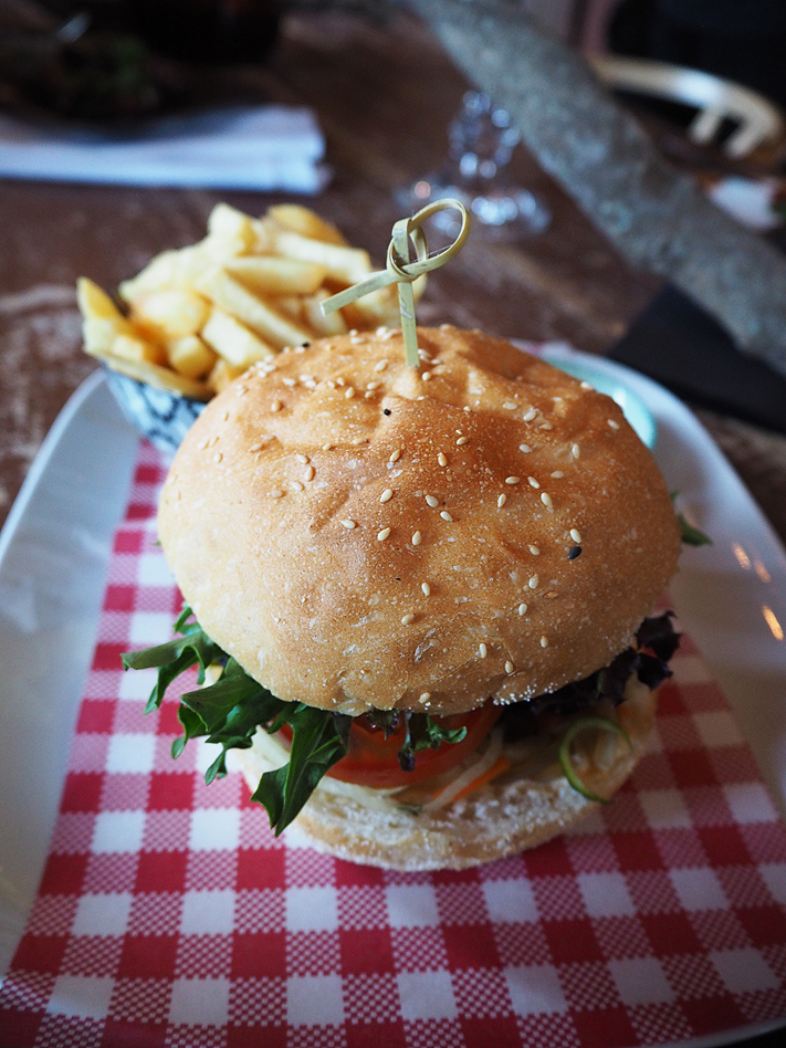 Chicken creole burger with a grilled chicken fillet with house-made pickled vegies, chipotle sauce, tomato, lettuce and fries;
