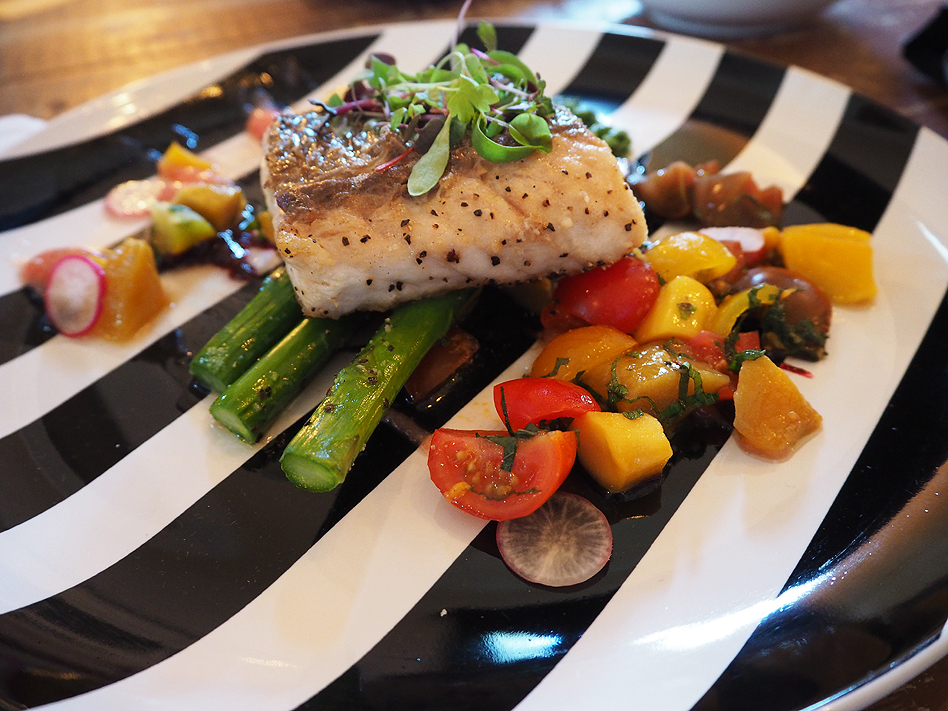 Pan seared snapper with a mango and heirloom tomato salsa, blackberry and peach gel;