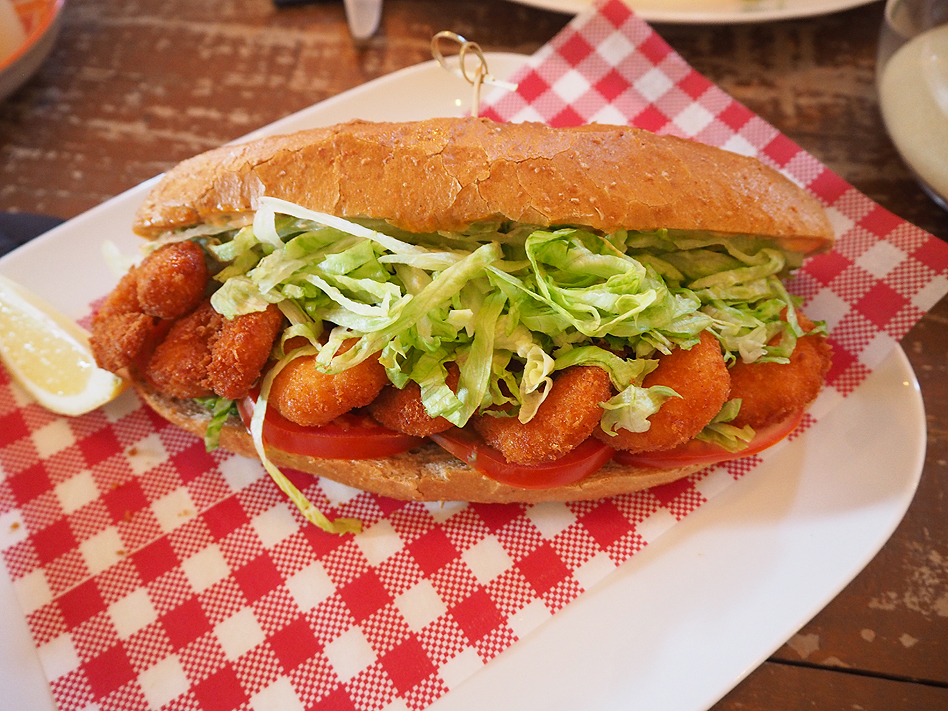 Shrimp Po Boy – a crusty roll with spicy aioli, lettuce, avocado, tomato and crumbed prawn;