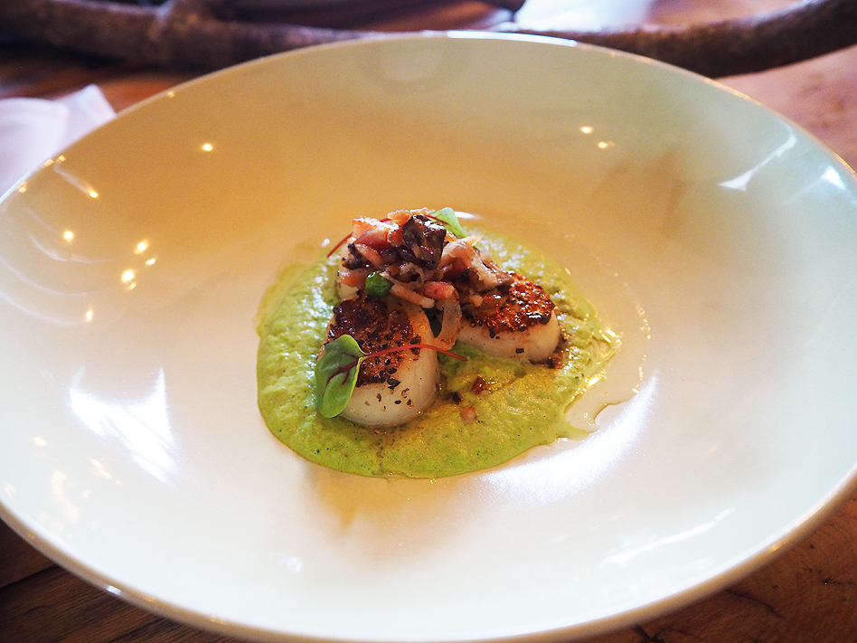 Seared scallops with bacon, shitake, shallots, asparagus puree, peas and truffle oil. (A personal favourite of Chef Symon);