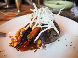 Scotch fillet with honey glazed vegetables, white pearl pea cassoulet, mash and OmNom dressing;