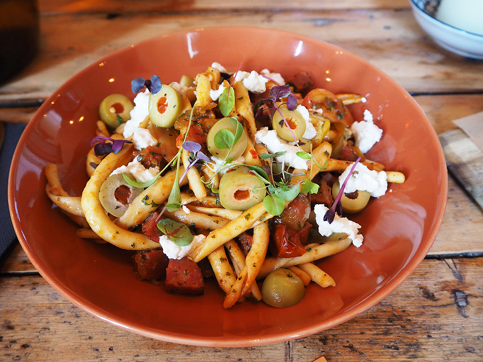 Strozzapreti with pepperade sauce, olives, chorizo, spinach, cherry tomatoes and Persian feta;