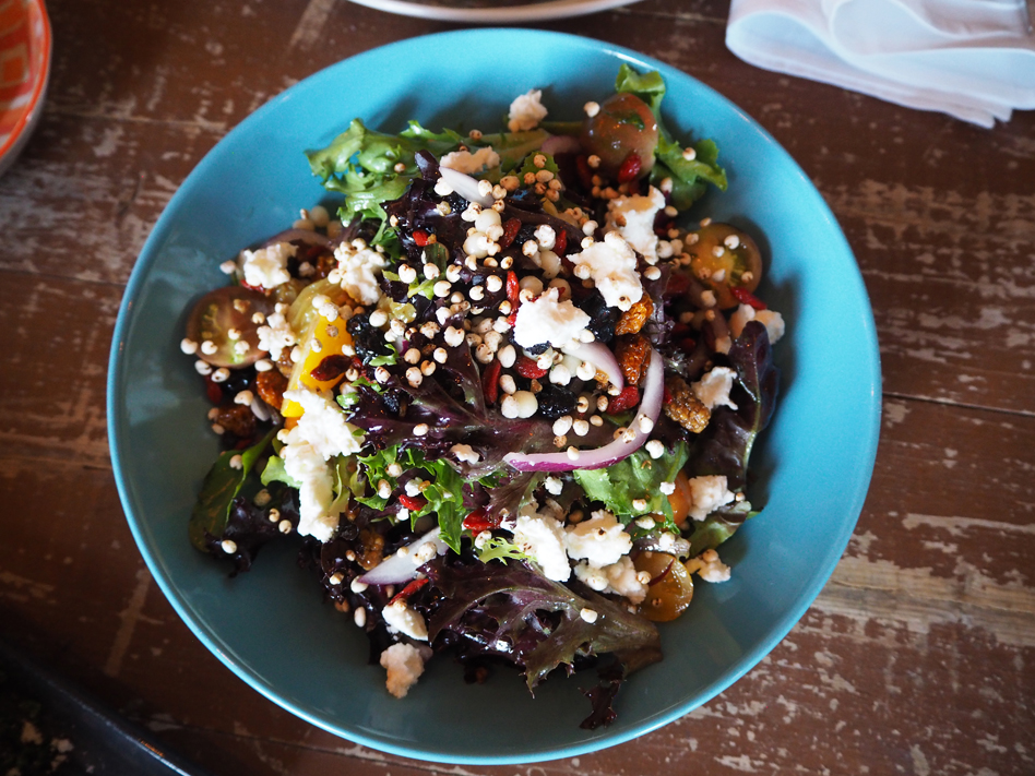 Superfood salad with mixed lettuce, butternut pumpkin, beetroot, wild rice, quinoa, goji berries, cranberries, pepitas, basil seed, puffed amaranth, balsamic maple dressing;