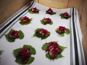 And Kinkawooka mussels on vine leaves with cauliflower cream and pickled red cabbage