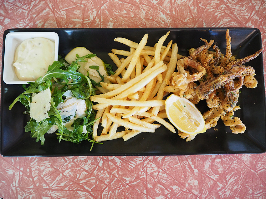 Lemon pepper calamari – lightly dusted with lemon pepper flour served with rocket and parmesan salad;