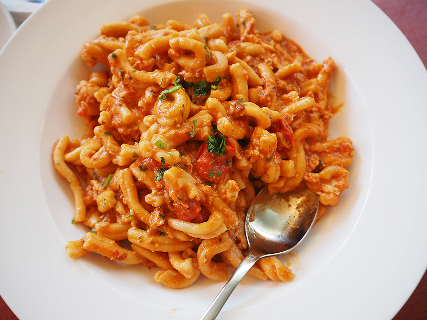 Cassarecce granchio – WA crab deglazed in white wine with cherry tomatoes in a rose sauce;