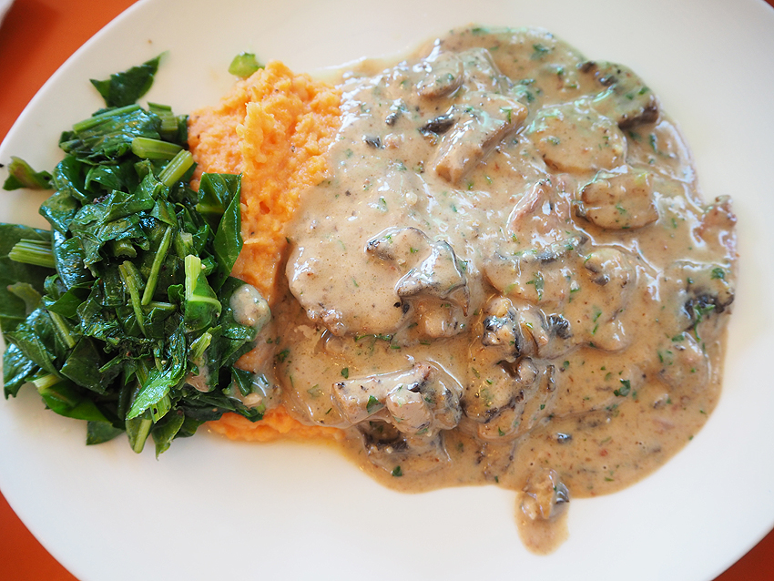 Scallopini funghi – pan fried veal served on sweet potato mash, seasonal vegetables and a thick creamy brandy mushroom sauce.