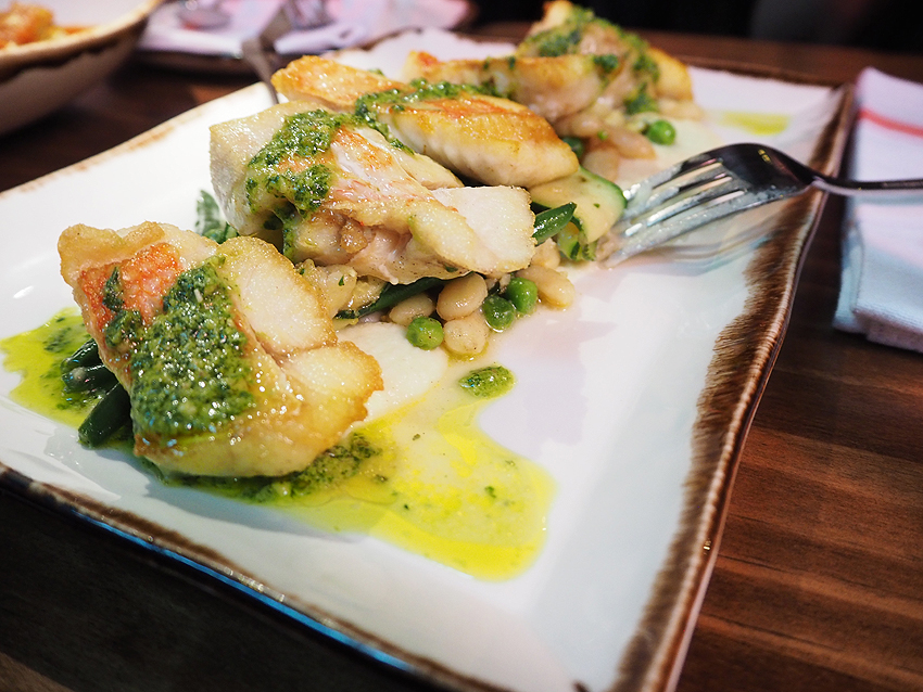 Roasted South Australian baby snapper with cauliflower purée, cannellini beans, peas, green beans, zucchini, basil pesto and lemon. The snapper was cooked to perfection and I was impressed with the large combination of vegetables. The pesto and lemon topped it off. Very enjoyable.