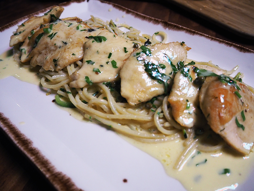 Chicken Piccata – herb and Parmesan crusted chicken in white wine, capers, lemon, zucchini on spaghetti aglio olio. Creamy al dente pasta with juicy chicken. Once again a very moreish dish.